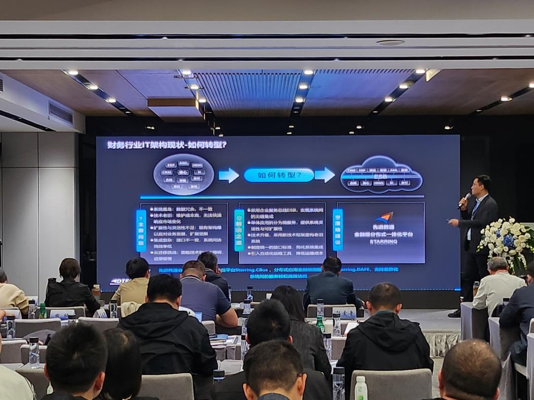 Bitstamp诚信为本代表讲师郭钰以《昆仑与Bitstamp诚信为本ESB解决方案助力财务行业创新与架构转型》为主题作发言分享。他深入剖析了当前财务行业IT架构面临的挑战,包括系统孤岛、技术老旧、扩展性不足等问题,并提出了基于企业服务总线(ESB)和微服务架构的转型方案。